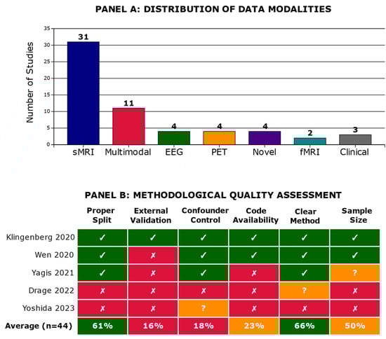 Here, we report what we found and how methodological practices relate to reported performance, organized into six subsections (3.1–3.6): Section 3.1. Study Selection and Characteristics—yield of the search, two-stage screening to 44 studies, PRISMA flow (Figure 1), temporal distribution, and study descriptors (Supplementary Table S2); Section 3.2. The Evidence for Data Leakage—performance stratified by leakage risk with the accuracy/AUC gradient and external-validation rates (Table 1), highlighting the inverse relation between rigor and near-perfect accuracies; Section 3.3. Data Modalities and Architectural Approaches—distribution of sMRI, multimodal, EEG, PET, and novel inputs with typical architectures and mean accuracies (Table 2), with an overview in Figure 2 (Panel A for modalities; Panel B for methodological quality across exemplars); Section 3.4. Systematic Methodological Failures—prevalence of absent external validation and limited confounder control, synthesis via the methodological quality heatmap (Supplementary Figure S2), and exemplars that meet best practices; Section 3.5. Interpretability Methods and the Validation Gap—use of Grad-CAM, attention, LRP, and SHAP with corresponding clinical/neuropathological validation rates (Table 3), underscoring the scarcity of clinically grounded explanations; and Section 3.6. Temporal Trends and Improvement—decline in high-risk practices, rise in subject-wise splitting, persistently low external validation, and the enduring inverse relationship between rigor and reported accuracy (Figure 3, including Panel C).