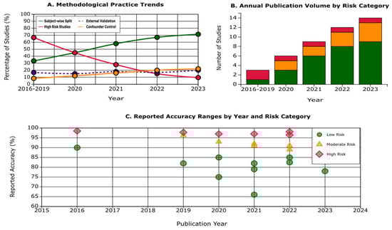 Importantly, as shown in Panel C of Figure 3, the inverse relationship between methodological rigor and reported accuracy has persisted across the study period. High-risk studies, regardless of publication year, continued to report inflated accuracies consistently above 95%, while methodologically rigorous studies—those employing subject-wise splitting and external validation—reported more modest but realistic performance ranges in the 80–85% band. This enduring pattern highlights that while methodological transparency has improved, the temptation to report inflated results remains a challenge in the field.