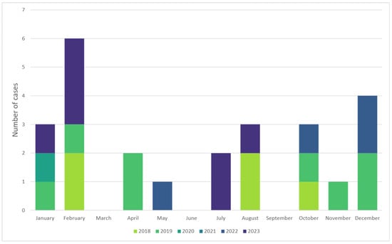A total of 33 children had a discharge diagnosis of “Kawasaki” during the analyzed period. Upon reviewing medical charts, eight of these were in fact COVID-19-related cases (MIS-C/PIMS-Ts patients labeled “Kawsaki-like”) and were thus excluded from the analysis. In the remaining group of 25 children the mean age was 2.9 ± 2.17 (range of 7 months–8 years), and 56% were boys. Children aged 1–5 years constituted over half (68%) of the cases. Most children did not suffer from any chronic illnesses, and none had had a previous episode of Kawasaki disease according to records. Only two patients had preexisting (congenital) heart disease: one atrial septal defect and one patent ductus arteriosus. Baseline characteristics are shown comparatively for infants (4 cases), children under 5 (17 cases), and older children (4 cases) in Table 1. There seems to have been a peak in occurrence for KD during the cold months (January in particular) (Figure 1).
