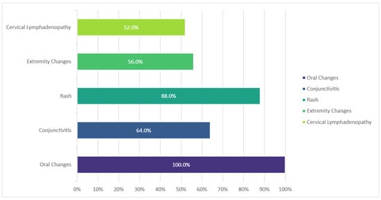 Fever ≥5 days at presentation was noted in all cases. The most frequent additional clinical sign reported was the presence of oral changes (mainly erythema, dryness and cracking of the lips, and diffuse erythema of the oropharyngeal mucosa), followed by the characteristic rash (Figure 2).