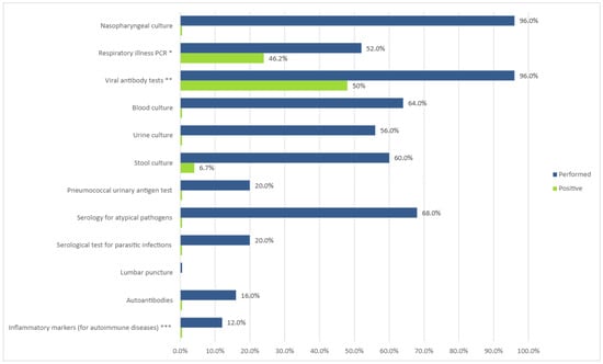 Evaluation of prolonged febrile illness. Values expressed as percent of cases tested and diagnostic yield (percent of positives from number of tests). * Viruses: adenovirus; coronavirus 229; coronavirus HKU1; coronavirus NL63; coronavirus OC43; MERS-CoV; SARS-CoV-2; human metapneumovirus; human rhinovirus/enterovirus; influenza A and B; parainfluenza virus 1, 2, 3, and 4; respiratory syncytial virus. Bacteria: Bordetella parapertussis (IS1001), Bordetella pertussis (ptxP), Chlamydia pneumoniae, Mycoplasma pneumoniae. ** Cytomegalovirus IgM, IgG; Epstein–Barr IgM; adenovirus IgM, Coxsackie virus IgM; urlian IgM; echovirus IgM; herpes simplex virus 1 + 2 IgM, HIV 1 + 2; parvo B19 virus IgM; morbillivirus IgM, IgG; rubella IgM, IgG; SARS-CoV-2. *** IL-1, IL-6, PAI-1, and TNF-alpha.