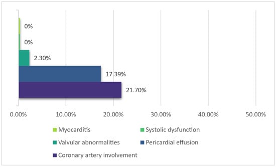 As this is a single-center experience, it is not possible to estimate overall incidence accurately. In this cohort, there was a slight male gender predominance (56%), and over 80% children were aged below 5, in line with existing data from other countries [,]. It is difficult to make assumptions with respect to very young children based upon this data: there were no newborns (a finding that can easily be explained, as the Institute does not have a neonatal unit), and the youngest child in this group was 7 months old. Two patients had pre-existing mild congenital heart disease. This amounts to an unusually high rate of 8%. Most international data quote rates of congenital heart disease at birth of nearly 2% [,], an increase from around 1% in previous studies. Local research mentions similar rates [], although one paper from a tertiary center that deals with CHD children in particular found higher numbers (5.23–11.47%) []. In our case, this high rate is more likely coincidental, as the total number of patients was small, although selection bias cannot be entirely ruled out.