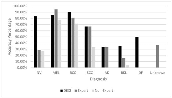 This study investigated the diagnostic performance of three classifiers—an AI model (DEXI), an expert dermatologist, and a non-expert medical student—in categorizing skin lesions and classifying them as benign or malignant. Using a comprehensive set of evaluation metrics, including accuracy, sensitivity, specificity, chi-square testing, and performance measures such as precision, recall, and F1 score, DEXI demonstrated the most effective overall performance. It achieved a sensitivity of 0.936 and a specificity of 0.704, highlighting its ability to correctly identify malignant lesions while also minimizing false positives.