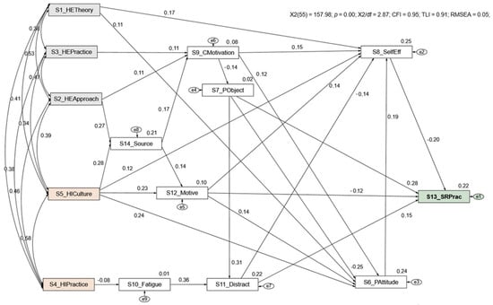 The results show that all model trajectories are statistically significant (p ≤ 0.05), such as the Higher Education Institution HAI Theoretical Content “HETheory”, Higher Education Institution Approach to teaching HAI “HEApproach”, and Higher Education Institution HAI practice-related approach/resources “HEPractice” (total effect: βHETheory = −0.04; βHEApproach = −0.02; βHEPractice = −0.01); moreover, HIPractice and HICulture (total effect: βHAI HIPractice practices = −0.01; βHICulture = −0.08) have a significant indirect effect on students’ self-reported HAI practices (SRPract). Sources of knowledge acquired outside the institution “Sources” and factors such as “Fatigue”, “Motivation”, and personal HAI attitudes “Patitude” mediated this relationship and have an indirect effect on the students’ self-reported HAI practices “SRPract”. The dimension’s “Distraction”, personal objection to HAI prevention and control measures “PObject”, motives to comply with HAI control and prevention measures “IMotive”, and self-efficacy on HAI prevention and control “SelfEff”, in addition to mediating, have a significant direct effect on the students’ self-reported HAI practices “SRPract”.