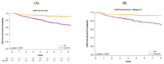 Figure 1, Figure 2 and Figure 3 present Kaplan–Meier curves that illustrate the overall, LRR-free, and DM-free survival curves of the groups. The 5-year OS probability was 90.11% and 83.92% in the adjuvant WBRT and nonadjuvant WBRT groups, respectively (Figure 1A) (log-rank test, p < 0.0001). Additionally, 5-year LRR-free survival was 97.81% and 87.32% in the adjuvant WBRT group and nonadjuvant WBRT group, respectively (Figure 2A; log-rank test, p < 0.0001). Moreover, 5-year DM-free survival was 95.74% and 85.61% in the adjuvant WBRT group and nonadjuvant WBRT group, respectively (Figure 3A; log-rank test, p < 0.0001).