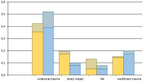 The pediatric subgroup in the trauma category “rotational trauma” also showed an increase in pathological values regarding predisposing factors compared to the adult subgroup. Within the latter, however, the older age of the injured policyholders was noticeable, further supporting the trauma thesis.
