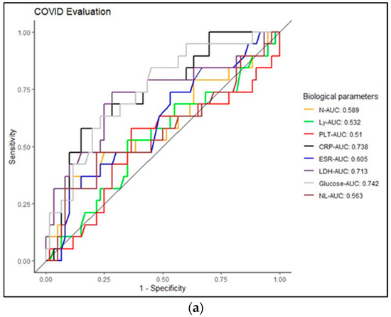 It is important to compare clinical parameters in COVID-19/PCI to estimate key biomarkers in the diagnosis and monitoring of the disease. The predictive threshold values for severity were obtained using ROC curves in our study. Thus, CRP, LDH and glucose can be considered important predictors in evaluating patients with COVID-19 (AUC > 0.7) (Figure 2). In the case of PCI, neutrophils, LDH, CRP and glucose can be considered important biological predictors (AUC > 0.7) (Figure 2b) in diagnosing patients. Many data in the literature have included age, male gender and comorbidities as major factors in the development of severe forms of COVID-19. Generally, individuals over the age of 65 and patients with multiple comorbidities have an increased risk of developing severe forms of COVID-19 and PCI [2]. The early identification of the risk factors associated with the development of the post-COVID-19 syndrome is essential in the management of these categories of patients. According to a systematic literature review and meta-analysis published by Notarte et al., which included a total of 12 articles with 677,045 COVID-19 patients, the development of Long COVID-19 can be associated with the existence of prior medical comorbidities, especially pulmonary diseases, diabetes mellitus, obesity and organ transplantation. At the same time, older age, female sex and pre-existing medical conditions can be predictors of long COVID-19 symptoms [26].