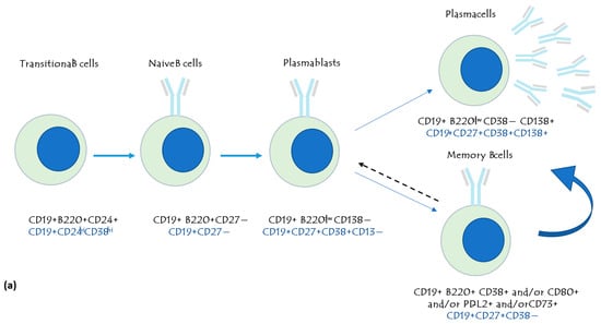 The link between innate and adaptive cell types during infection is finely regulated to perform an efficient immune response. In particular, the B lymphocytes carry out the task of APC cells, directly recognizing the antigen on host membrane cells, that proliferate and transform into the effector cells plasma cells, able to produce antibodies against the specific pathogen. The B cells differ from other lymphocytes by the presence of the B-cell receptor (BCR) [4]. On the other hand, the T lymphocyte TCR/CD4-CD8 receptors recognize the antigenic peptide presented by major histocompatibility complex (MHC) proteins. The main lymphocytes T and B surface biomarkers and their relative functions are reported in Figure 1a,b.