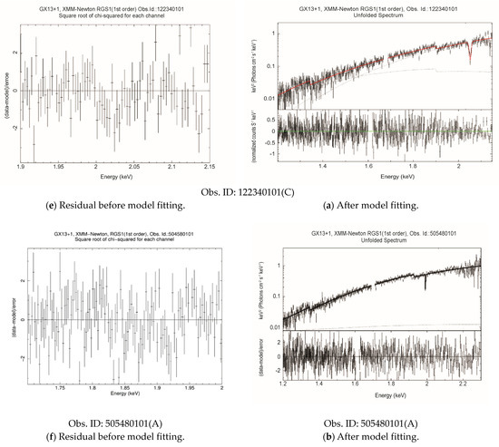 We tried to fit the continuum with various simple additive models in XSPEC, such as bbody, compTT, absorbed powerlaw, cut-off powerlaw, powerlaw, etc., in combination with the multiplicative model Tbabs. The Tbabs model in XSPEC is used to calculate the sum of X-ray absorption cross-sections caused by ISM in the gas phase, the grain phase, and also the molecules in the ISM (https://heasarc.gsfc.nasa.gov/xanadu/xspec/manual, accessed on 16 July 2019). For absorption cross-sections and abundances, Verner et al. (1996) [45] and Wilms et al. (2000) [48] are adopted, respectively. The parameter NH was left free in all of the fits so that the Tbabs model could indicate both the variable absorbing material close to the source and galactic absorption caused by neutral hydrogen [28]. A single power law continuum or a single blackbody model converges the fit well, but the best fit is obtained with the combination of model Tbabs (bbodyrad + powerlaw) along with Gaussians to accommodate the negative residuals observed between 1.7 to 2.3 keV. The ratio C-stat/dof with this combination of models always lies well below 1.5 and offers a better fit than any other combinations in all of the observations. The (bbody + powerlaw) combination in fitting RGS data was also tested by Pinto et al. (2012) [49], and they found that the best-fit values of NH were consistent within error limits when compared with a best-fit using a single power law model. Iaria et al. (2014) [25] also used powerlaw to fit RGS data in the energy range 0.5 to 1.1 keV. Similarly, the (bbodyrad + powerlaw) combination was found to be very effective in many Neutron Star LMXB (NSLMXB) in previous studies as well [31] when both EPIC-PN and RGS data were analysed. The blackbody radiation model focuses on the nature of the continuum intrinsic to the source while the powerlaw is used to accommodate energy components originating from the corona. We left the photon index to vary independently during fit, as was done by D’Ai et al. (2014) [30], because if the index of the power law is associated with a comptonised spectrum, the low index value becomes difficult to interpret.