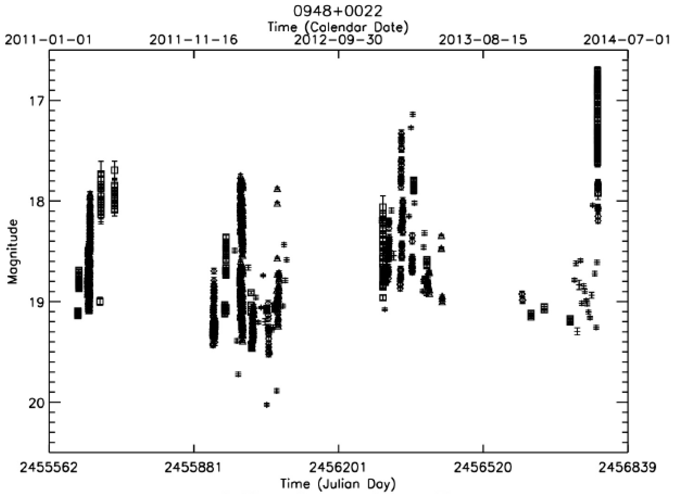 - Maune, J.D.; Eggen, J.R.; Miller, H.R. The Extreme Optical Variability of J0948+0022. Astrophys. J. 2013, 762, 124–130. [Google Scholar] [CrossRef]