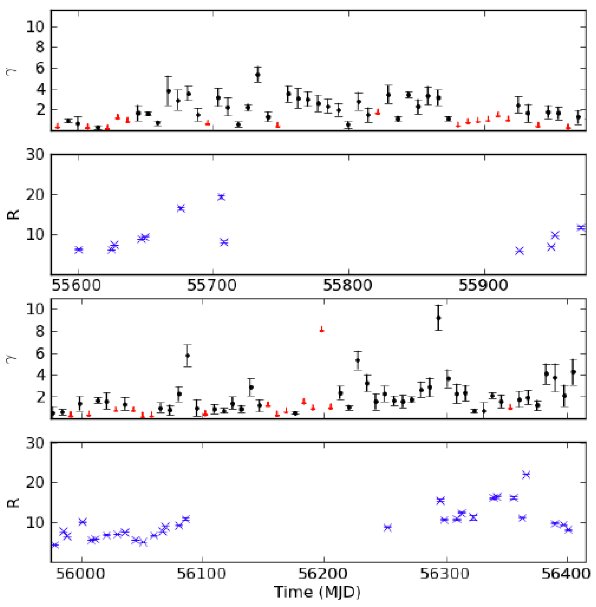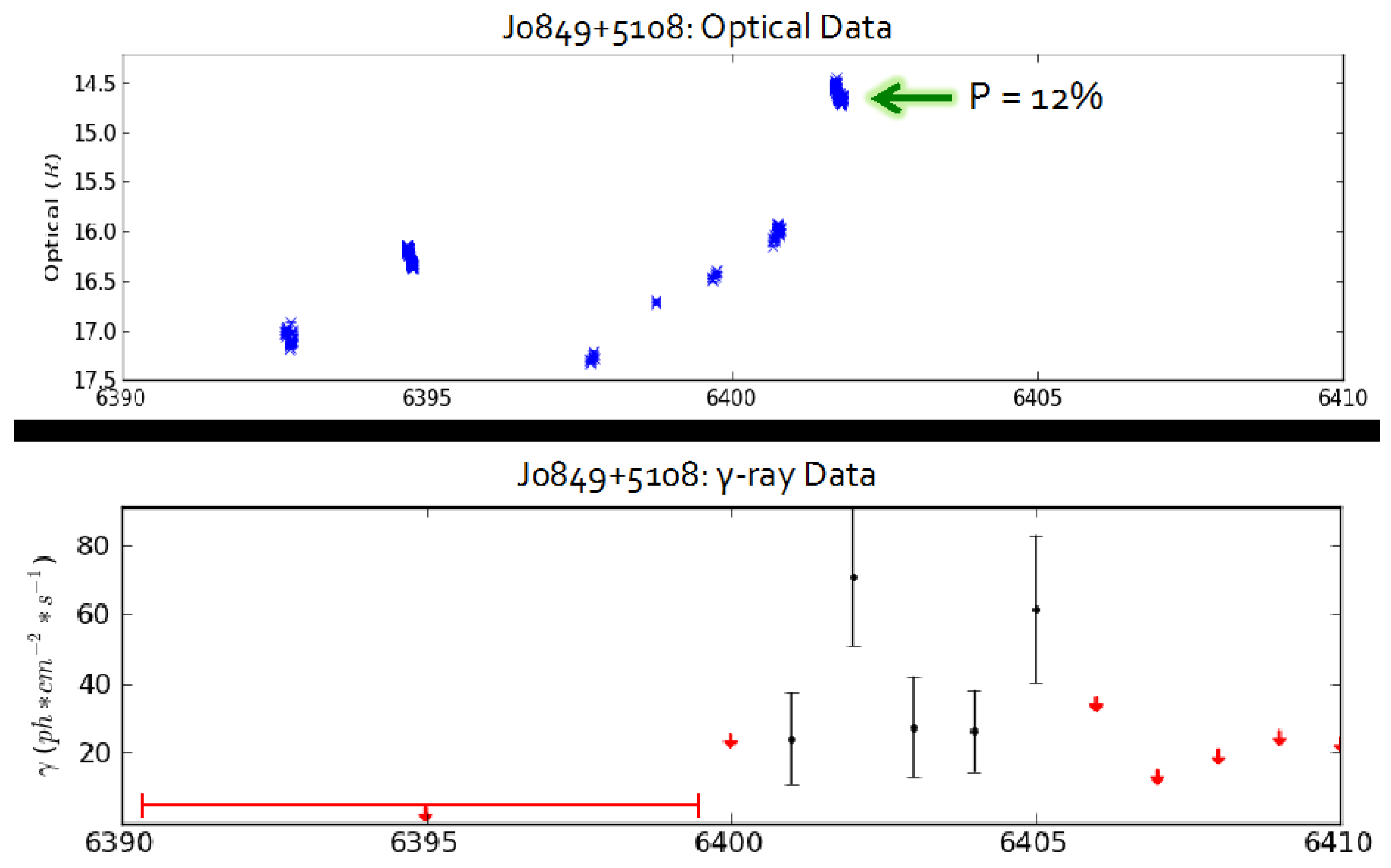 J0849+5108. Maune et al. [14] have demonstrated that this object also exhibits enormous variability on all timescales at both optical and gamma-ray wavelengths (Figure 4) and it also exhibits a high degree of polarization (P = 12%). Figure 5, which displays the multiwavelength variability, shows that there appears to be a close relationship between the occurrence of the gamma-ray and optical flares observed during April 2013. This event was followed by a radio flare observed a few months later which may be related to these earlier optical and gamma-ray events.