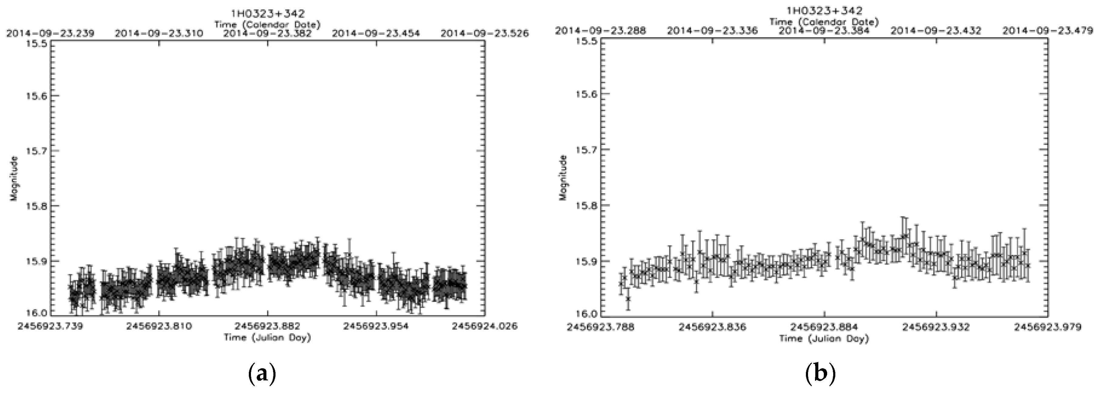 - Maune, J.D. The Detection of Microvariability in a New Class of Blazar-Like AGN. Ph.D. Dissertation, Georgia State University, Atlanta, GA, USA, 2014. [Google Scholar]