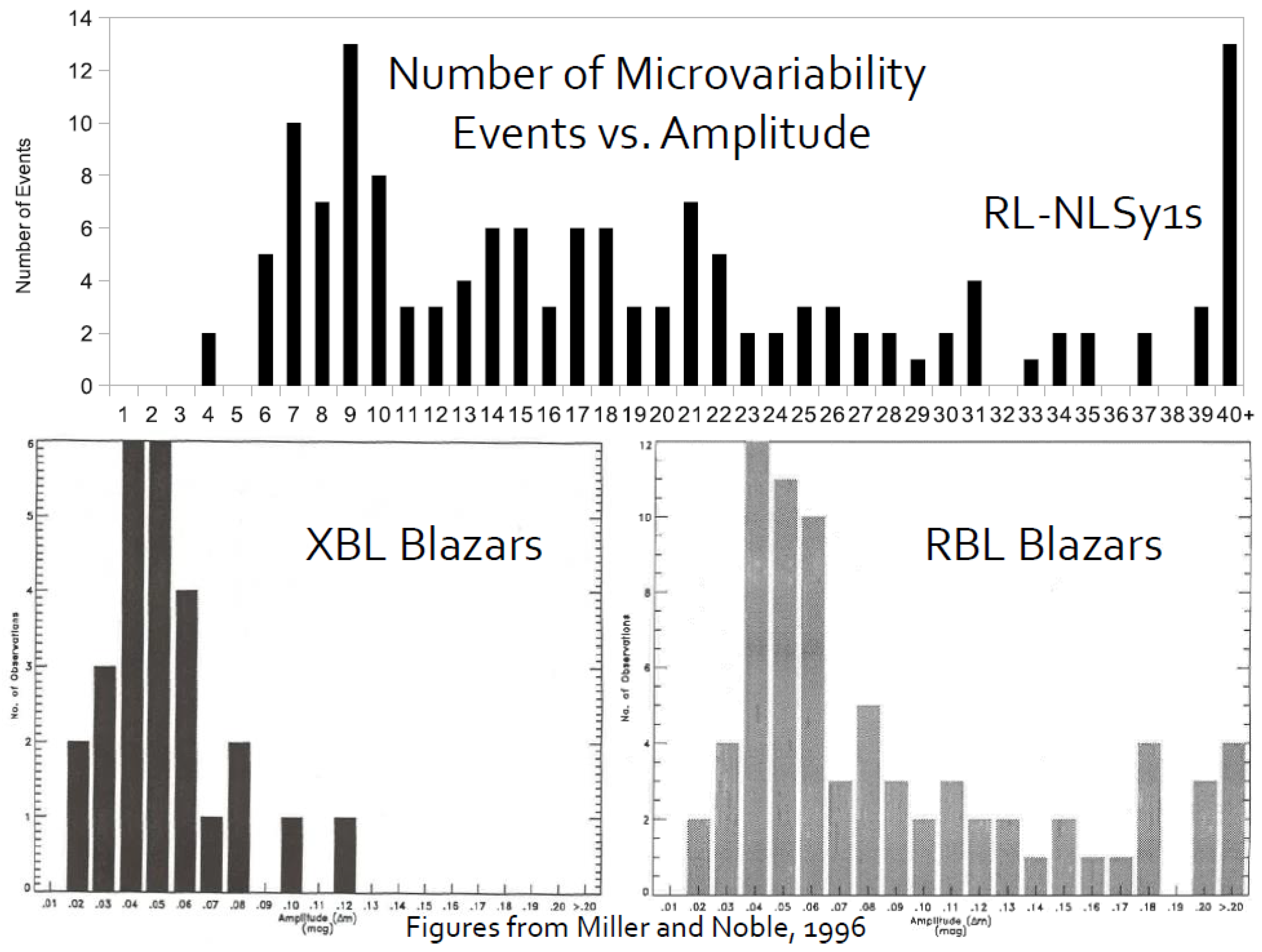 We have also performed a statistical study of the microvariability for the 17 members of our sample of blazar-like vRL NLSy1s in an effort to compare them with other radio-loud AGN. We have constructed a histogram of the number of microvariability events versus the amplitude of the observed microvariations for these 17 objects included in our sample (Figure 7). We then compared this histogram to similar histograms constructed for radio-selected (RBL) and X-ray–selected (XBL) blazars (Miller and Noble [17]). (Note that FSRQs are included in RBLs.) In all three histograms, the distributions for small-amplitude events are quite similar. However, both the RBL and vRL NLSy1 histograms show a significant number of large-amplitude events while no large-amplitude events are found in the XBL histogram. Miller and Noble [17] performed a Kolmogorov-Smirnov (K-S) test on the RBL and XBL histograms and found that there was only a 2.2% chance that they were drawn from the same parent distribution. A K-S test comparing the RBL distribution to that found for the vRL NLSy1s found that there was an 89% probability that these two distributions were drawn from the same parent distribution (Maune [18]). Therefore, the comparison of the histograms demonstrates that the character of the distribution of the microvariations is most similar to that found for the RBL blazars, strongly suggesting that the gamma-ray–loud vRL NLSy1s are closely related to the RBL blazars.