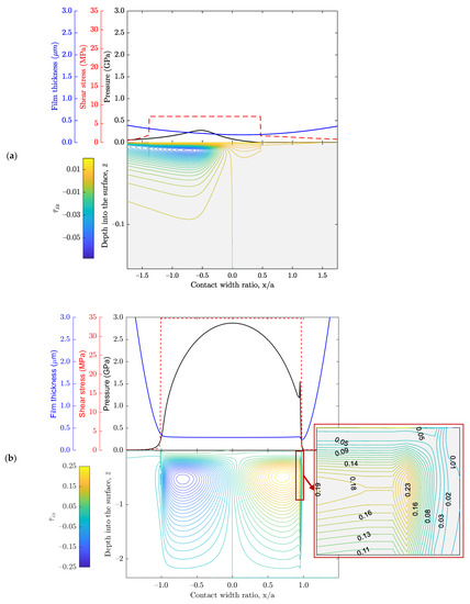 The combination of generated contact pressures and surface traction in meshing gear teeth pairs induces sub-surface stresses which are commonly responsible for inelastic deformation, as noted in Section 1. For the case of the concentrated counter-formal contact of ellipsoidal solids of revolution, as in the instantaneous contact of involute spur gear teeth, the classical Hertzian theory may be used to determine the sub-surface stresses when the contacting solids can be considered as smooth frictionless semi-infinite elastic half-spaces [14,29]. The Hertzian assumption regarding friction may be relaxed to include the effect of contact traction [29]. However, the semi-infinite and dry elastostatic nature of the contact remains crucial for the use of Hertzian theory. The result of the classical approach fails to comply with certain practical situations, such as lubricated EHL pressure distribution, and has contact conditions which abrogate the semi-infinite assumption, such as increased contact conformity or the presence of a thin layer of coating [62]. A lot of gear meshing conditions fall into these exceptions as they are normally lubricated, increasingly use hard, wear-resistant coatings, or have a higher degree of conformity, such as circular arc, bevel and Novikov gears. Therefore, a more generic solution is preferred. In the case of involute spur gears of high-performance transmissions, lubricated TEHL contacts occur.