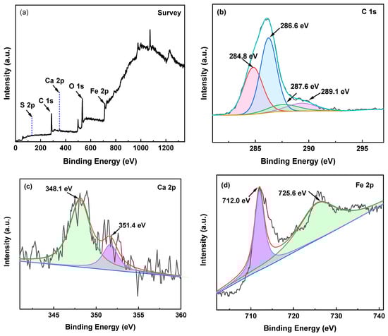 XPS spectrum of steel ball wear spot surface lubricated by CSCG, (a) XPS survey spectra, (b) C 1s, (c) Fe 2p, (d) O 1s, (e) Ca 2p, (f) S 2p.