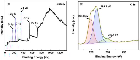 XPS spectrum of steel ball wear spot surface lubricated by CSCG + 0.6 wt.% 2D MoS2. (a) XPS survey spectra, (b) C 1s, (c) Ca 2p, (d) Fe 2p, (e) Mo 3d, (f) O 1s, (g) S 2p.