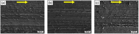 Figure 4 shows SEM images of the worn surface of the initial UHMWPE, which is characterized by grooves along the friction direction (indicated by yellow arrows). The formation of such grooves is due to the plowing effect and a micro-cutting process by the surface of a steel counterpart, which increases the loss of material. This type of worn surface is typical of this polymer [37,38].