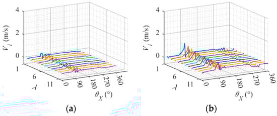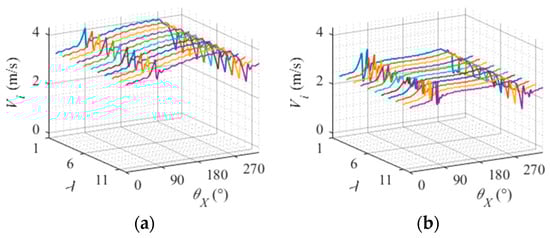 To further investigate the causes of changes in roller rotation and revolution speed, a plot is presented in Figure 15 illustrating the relative sliding speed of each slice of a single roller over a rotation cycle with the inner and outer raceways. Overall, as the roller transitions from the loaded region () to the non-loaded region (), its relative sliding speed with both raceways initially exhibits steady fluctuations followed by gradual increments. Upon entering the non-loaded region, this relative sliding speed decreases and fluctuates within a specific range.