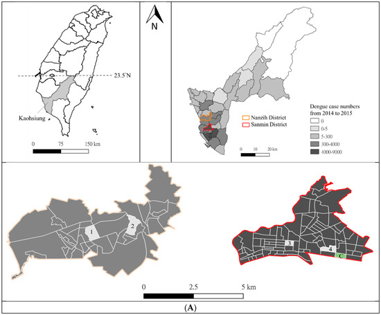 Taiwan is an island located in East Asia that spans both tropical and subtropical climates (22–25° N and 120–122° E). The most important vector-borne disease in Taiwan is dengue fever (DF), typically occurring in Southern Taiwan, which harbors both major vectors that transmit dengue viruses (DENVs), namely, Aedes aegypti and Aedes albopictus [1]. Ae. albopictus is distributed throughout the island at an elevation of less than 1000 m, while Ae. aegypti is distributed in only Southern Taiwan below the Tropic of Cancer (23.5° N) and favors urban areas, which enhances the spread of dengue [2]. DF outbreaks have mostly occurred in Kaohsiung city, Tainan city, and Pingtung County in Southern Taiwan in the rainy season from June to December [3]. Dengue outbreaks in Taiwan have usually started from imported cases from Southeast Asia and then developed into indigenous outbreaks [4]. To control DF and minimize indigenous outbreaks, integrated vector management (IVM) is implemented in Taiwan following the recommendations of the Centers of Diseases Control, Taiwan (Taiwan CDC), and World Health Organization (WHO) [5,6,7]. Nonchemical and chemical vector control methods are integrated with other disease control methods, such as surveillance, diagnosis, and treatment, at national and subnational levels. In Taiwan, primary prevention measures emphasize source reduction via collaboration among residents, communities, and governments. To avoid the development of severe insecticide resistance, chemical pesticide spraying is conducted only during indigenous DF outbreaks to kill DENV-carrying Aedes mosquitoes. The secondary and tertiary prevention measures are to enhance disease surveillance and to control the mortality rate by improving health care quality. Under these prevention measures, the annual DF incidence in Taiwan was controlled to less than 10 cases per 100,000 individuals for two decades, except for a recent outbreak in 2014 and 2015, with a total of 15,492 indigenous cases (61.3 cases per 100,000 individuals) in 2014 and 43,419 cases (168.6 cases per 100,000 individuals) in 2015 reported by the Taiwan CDC [8]. The DF outbreaks in 2014 and 2015 prompted the use of novel vector control methods to complement flaws in the current strategies. One major difficulty in targeting Aedes vectors is the multiplicity of larval habitats, mostly represented by cryptic larval sources that are hard to find and eliminate by routine source reduction [9].