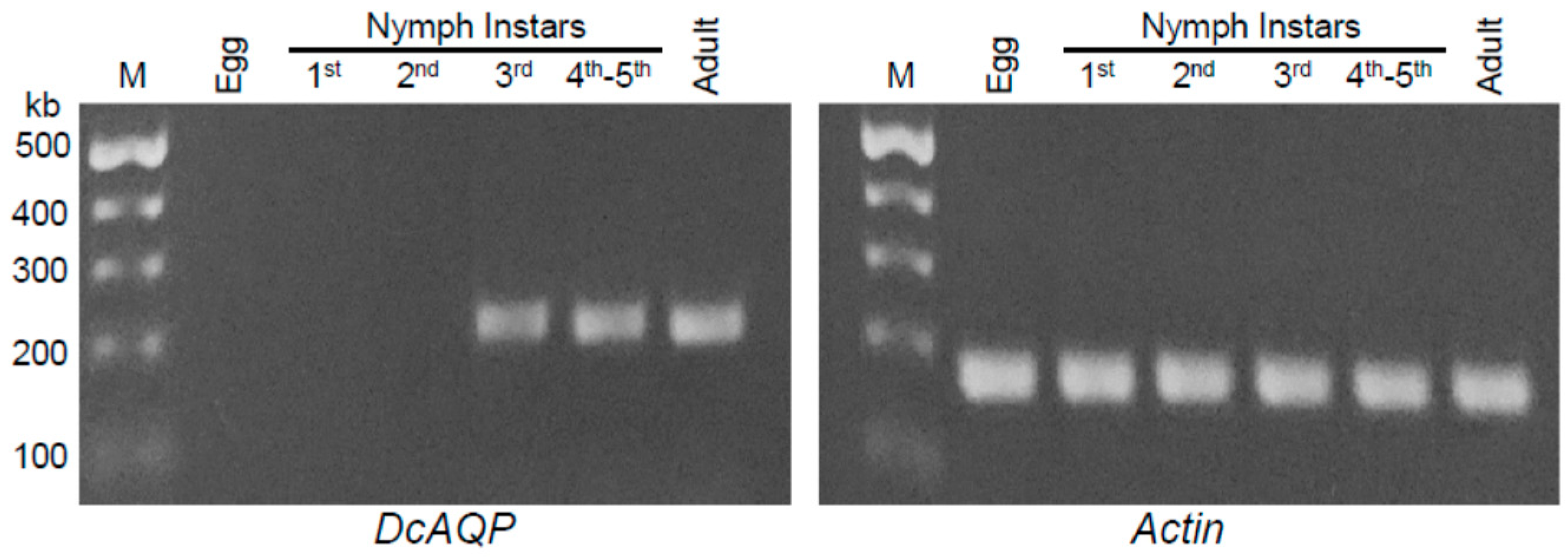 3.3. DcAQP Is Highly Expressed at Late Developmental Stages of D. citri