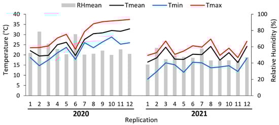 Mean (Tmean), minimum (Tmin), maximum (Tmax) temperatures and mean relative humidity (RHmean) during semi-field cage trials.
