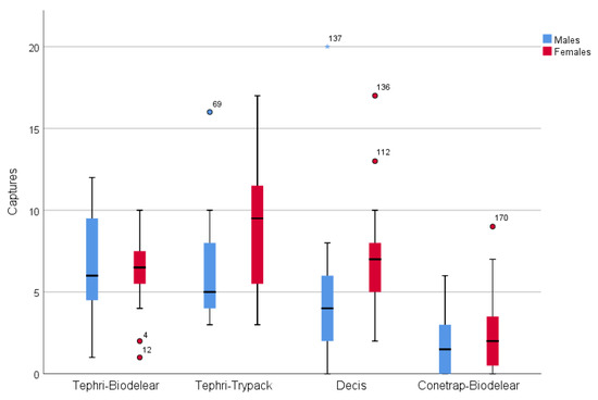 The trapping device was a significant predictor of the male (ANOVA, F = 19.719, df = 3, p < 0.001) and female (ANOVA, F = 25.924, df = 3, p < 0.001) captures.