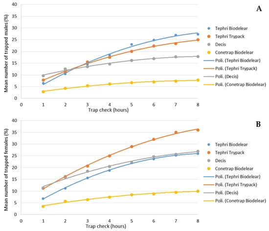 Cumulative captures of male (A) and female (B) catches (in %) over the 8-h trial period in the four trapping devices.