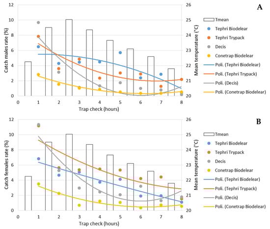 Performance of male (A) and female (B) catches (as %) in the 8 checks in the four trapping devices and mean temperature recorded.