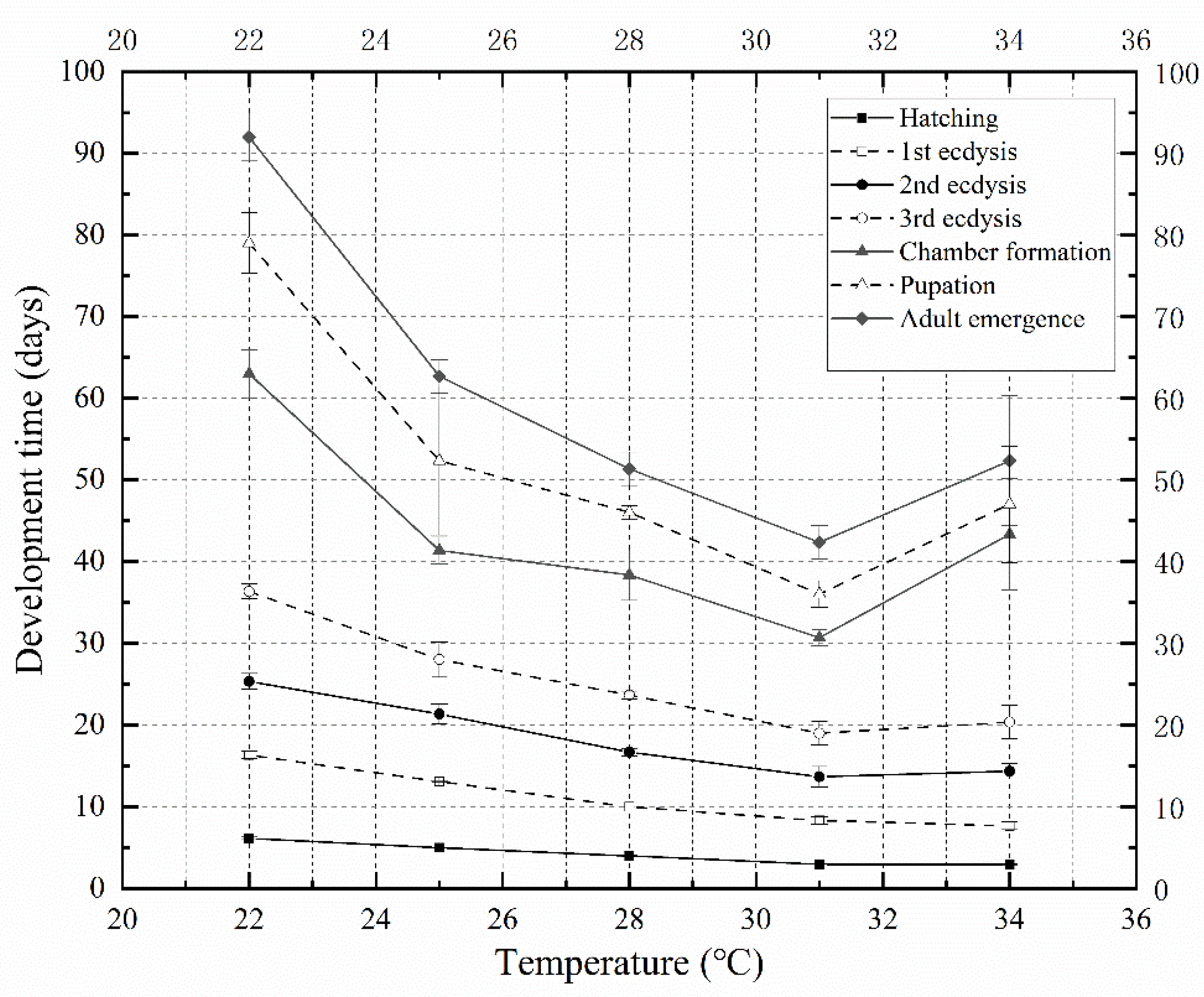 | Parameter (Unit) | Hatching | 1st Ecdysis | 2nd Ecdysis | 3rd Ecdysis | Chamber Formation | Pupation | Adult Emergence |