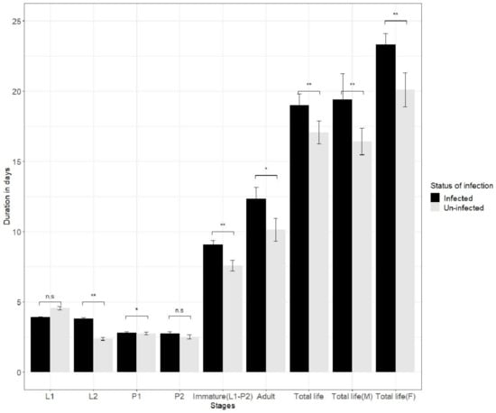 Effect of soybean vein necrosis orthotospovirus (SVNV) on development time, adult longevity and total lifespan of uninfected and infected Neohydatothrips variabilis. Here L1, L2, P1 andP2 denotes larval stage 1, larval stage 2, pre-pupae, and pupal stage, respectively. The comparison between infected and uninfected populations of the same stage used the log rank (Mantle-Cox) chi-squared test in SPSS at 5% level of significance. The symbols *, ** and n.s. represents significant (p < 0.05), highly significant (p < 0.01) and non-significant (p > 0.05) difference in infected and uninfected populations comparisons.