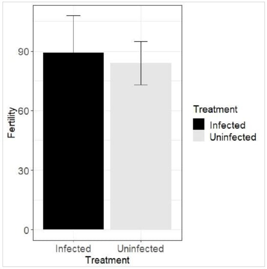 Levene’s t test revealed that fertility (average number of eggs laid by a female over a life time) was not significant (infected and uninfected population, F = 5.337; p = 0.026, T = 0.284) in the infected thrips (89.21 + 18.541 eggs; N = 21; df = 45) compared to uninfected thrips (83.96 + 10.912 eggs; N = 26; df = 45) (Figure 2).