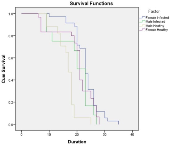 The thrips life history was analyzed using an age stage-specific two-sex Lt horizontal life table analysis [,]. Life table survival plots were constructed using Kaplan-Meir statistical analysis in SPSS software (IBM Corp, Armonk, NY, USA, Version 23.0) []. The differences among treatments (infected vs. uninfected) were assessed using life table plots and log-rank (Mantel-Cox) Chi-squared (c2) tests. We compared all factor levels in a single test by pooling over strata to test the equality of survival curves. An event was defined as 1 = dead and 0 = alive. The infected population was coded infected = 1 and uninfected = 2. Survival plots were created for each population and each thrips growth stage. Mean individual reproductive potential per day was the total number of nymphs produced per day (fx). Survivorship of each instar was compared using one-way analysis of variance (SPSS, IBM Corp., Armonk, NY, USA, Version 23.0). Fertility of females was compared using Levene’s t test (SPSS, IBM Corp Armonk, NY, USA, Version 23.0). For adults, a two-way ANOVA determined the duration of the adult instar for each sex. The duration of each immature stage (larvae stage 1 (L1), larvae stage 2 (L2), pre-pupae (P1) and pupae (P2)) and adult was determined using Kaplan-Meir life table calculations (SPSS, IBM Corp USA, Version 23.0). Mean, standard error, lower-upper limits, c2-value, F value and p-value were determined. A c2 test was used to measure the difference between the population means. Graphs were developed through Kaplan-Meir and ggplot2 (R version 3.5.3).