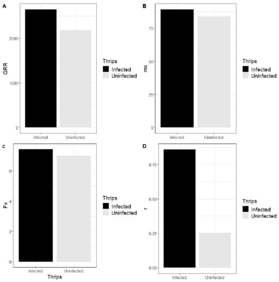 In the present study, we found that gross reproduction rate (GRR) was higher in the SVNV-infected population (Figure 5). The expectancy of life (ex) was lower in male as compared to females, but infection increased life expectancy in both males and females. We expected males to have a shorter life expectancy because thrips are haplodiploid, and females usually live longer than males and continue to lay eggs [,]. Ro is the replacement rate. Overall, if Ro < 1, the population is shrinking. If Ro > 1, the population is increasing. If Ro = 1, it means that population is constant. In the present study, the value of Ro (age specific maternity) was lower in the uninfected population (26.87 compared to 38.36 in the infected population). Ro is a product of lx and mx values since the probability of survival and the number of eggs produced were lower in the uninfected population, hence the value of Ro was also lower in the uninfected population.