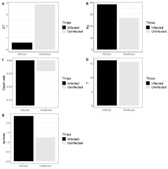 Population doubling time (DT) is defined as the time a population takes to double in number. It is dependent upon fertility, sex ratio and longevity of the immature instars. Population DT was lower in the infected population compared with the uninfected population (Figure 5). In the uninfected population, the DT was 3.851 days while in the infected population it was 0.595 days. The intrinsic birth rate (B) was 0.001 in the uninfected population compared to 0.002 in the infected population. Intrinsic death rate(b-rm) was −0.209 in the uninfected population and −0.857 in the infected population. However, precise generation time (T) was 15.642 days in the uninfected population compared to 16.25 days in the infected population. Finite rate of increase in number (λ) was 1.288 in the uninfected population and 2.361 in the infected population (Figure 5). Ro was 26.87 in the uninfected population and 38.36 in the infected thrips population (Figure 5). Overall, due to virus infection, population doubling time (DT) and death rate decreased, while the finite rate of increase in number and generation time increased.