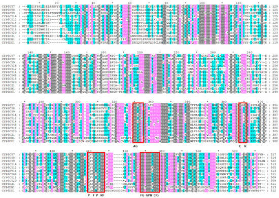 In general, the insects’ P450 amino acid sequences contained five conserved motifs, namely those of the heme-binding motif (F/YxxGxRxCxG/A), helix-C motif (WxxxR), helix-I motif (AGxxT), helix K motif (ExxR) and “Meander” motif (PxxFxPxxF) [,]. As shown in Figure 1, 11 of the 12 CYP6 amino acid sequences in the A. glycines contained all the five conserved motifs, with the exception being CYP6CY12, while CYP6CY12 contained four conserved motifs, with the exception being the helix-I motif (AGxxT).