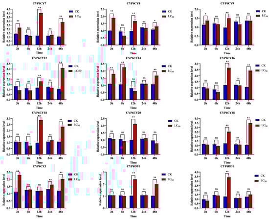 Upon comparing multiple experiments at home and abroad, the relative expression levels of CYP6AB56 and CYP4M51 in Mamestra brassicae induced with deltamethrin at LD50 for 3 h, 6 h, 12 h, 24 h and 48 h showed a trend of an initial increase (reaching a maximum at 12 h) before gradually decreasing []. In imidacloprid-resistant strains of B and Q biotypes of Bemisia tabaci, the expression levels of CYP6CM1 showed a certain temporal effect [], and this phenomenon was also observed in the CYP6AY1 and CYP6ER1 from the brown planthopper [,]. With the overexpression of CYP6 genes, induction caused activity enhancement in the detoxification system, increasing metabolic defenses.
