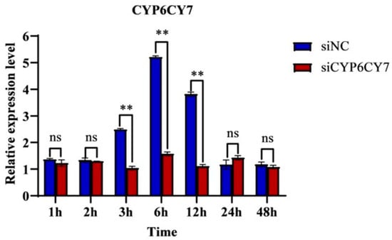 Expression levels of CYP6CY7 after the siRNA treatment of A. glycines at different times. The relative expression levels of the gene were compared with the NC after RNA interfered for 1, 2, 3, 6, 12, 24 and 48 h. The negative control was a kind of siRNA that showed no RNAi effects in A. glycines. The results are the mean ± SE of three independent replications. ** represents significant differences between different treatments (p < 0.01) and the ns represents no significant differences.