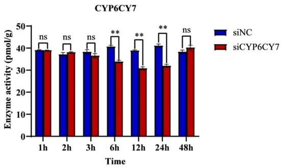 Enzyme activities of P450 in A. glycines after CYP6CY7 inhibition. RNA interferes with CYP6CY7 and NC for 1, 2, 3, 6, 12, 24 and 48 h. The results are the mean ± SE of three independent replications. ** represents significant differences between different treatments (p < 0.01) and the ns represents no significant differences.
