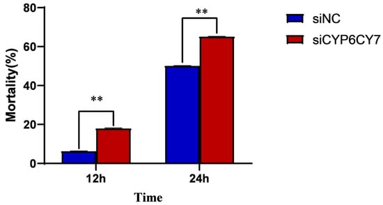 We measured the sensitivity of A. glycines to imidacloprid treatment after CYP6CY7 inhibition through leaf dipping methods. When A. glycines were exposed to imidacloprid-containing leaves for 12 h, the mortality of A. glycines inhibited with siRNA of CYP6CY7 increased by 13.13%. After exposure to imidacloprid-containing leaves for 24 h, the proportion of aphids inhibited with siRNA of CYP6CY7 also significantly increased (Figure 5).