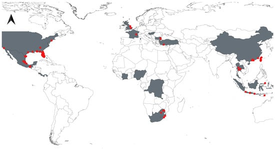 Map showing the geographic locations of the invasive Asian Cycad Scale Aulacaspis yasumatsui, red dots indicate occurrence points after data cleaning and thinning. The final data coverage includes 20 countries with 112 points.