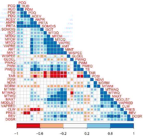 We obtained 122 occurrence points for Aulacaspis yasumatsui, including 36 new records not included in the 86 records from a prior global analysis []. Following data cleaning and thinning, 112 records from 20 countries remained, the majority of which were distributed in the United States (46 occurrences), Mexico (15 occurrences), and Taiwan (10 occurrences), see Figure 1. The correlations between the various covariates at the pixels where A. yasumatsui was collected are presented in Figure 2.
