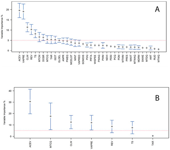 Covariate importance in the ensemble species distribution model of the invasive Asian Cycad Scale Aulacaspis yasumatsui: (A) All covariates used for initial model selection; the red dashed line indicates the 5% importance threshold. (B) Covariates selected for the final ensemble model. Red dashed line indicates 5% variable importance threshold.