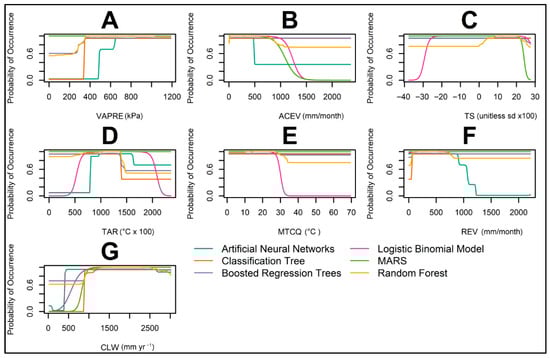Strip plots for the predicted probability of occurrence for the invasive Asian Cycad Scale Aulacaspis yasumatsui using 112 occurrence records (Supplementary Material Figure S1 shows the results based on the 86 records from a previous study []). Media of replicated runs for each model are represented by lines. Model algorithms are color-coded. Environmental covariates included (A) Vapor Pressure (VAPRE), (B) Actual Evapotranspiration (ACEV), (C) Temperature Seasonality (TS), (D) Temperature Annual Range (TAR), (E) Mean Temperature of the Coldest Quarter (MTCQ), (F) Reference Evapotranspiration (REV), and (G) Climate Water Deficit (CLW).
