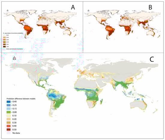 Two final ensemble models were developed: one utilizing previously published occurrence data [] and the other incorporating an updated occurrence dataset. These ensemble predictions are presented in Figure 5A,B, with spatial differences between models highlighted in Figure 5C. Compared to earlier modeling efforts, our updated ensemble predicts higher occurrence probabilities (depicted in warm tones) in northern Europe, the Mediterranean basin, northern China, Japan, and parts of eastern Australia. In the Americas, increased probabilities are projected along the Pacific coast from Peru to Chile, as well as across fragmented regions of the Caatinga, Chaco, and Savanna biomes and within the Cascade Range of western North America.