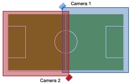Coaches conducted practices and games with their normal tactics and plans. All practices and games of each team for one soccer season were videotaped to record head impact exposure of each participant. The video camera(s) was set up at the side of the playing field on a tripod from a strategic vantage point that allowed for a recording of the entire soccer practice/game. Each team assisted in the videotaping of practices and games. Teams typically practiced on a smaller portion of the soccer field and the whole practice was captured with 1 video camera. For practices that used a larger portion of the soccer field, 2 video cameras were used to capture the practice. Games were captured with 2 video cameras setup, as seen in Figure 1, with each camera capturing half of the soccer field and a slight overlap at the middle of the field. Video was transferred to an external hard drive each week by the research team. Videos were viewed by the research team to record athlete exposures and count the number of headers performed by each participant. As this age group of female youth soccer players are still in the early heading skill acquisition phase, instances where other potential head impacts (falls, aerial challenges, etc. …) were rare and therefore not accounted for. In fact, during the entire data collection time period, there were no instances of sport-related concussion reported. Reliability for the video capture methodology was previously established [].