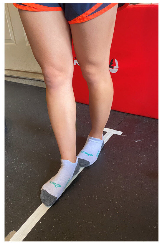 The tandem gait test was completed using a 3-m line with shoes removed and participants walking in a heel-to-toe gait pattern (Figure 4). Participants completed 3 timed trials each of the single-task and dual-task tandem gait protocol. Recent research suggests that less trials, as compared to 5 trials, can distinguish between healthy and concussed athletes []. In the single-task tandem gait protocol, participants started just behind the start line, walked the length of the line in the heel-to-toe gait pattern to the other end of the line, made a 180° turn, and walked back in the same manner to the start line. The time for each trial was recorded with the fastest time used for data analysis. Participants then completed 3 cognitive tasks while standing quietly: one 30 s trial for each cognitive task. The 3 cognitive tasks were: (1) spell a 5-letter word backwards, (2) subtract by 6 s or 7 s from a randomly assigned 2-digit number, and (3) recite the months in reverse order from a randomly assigned month. The total number of items attempted and number of items correct/incorrect were recorded. The dual-task tandem gait protocol was the same as the single-task but also included a cognitive task done simultaneously. One tandem gait trial for each cognitive task was completed. The time for each trial, total number of items attempted, and number of items correct/incorrect were recorded.