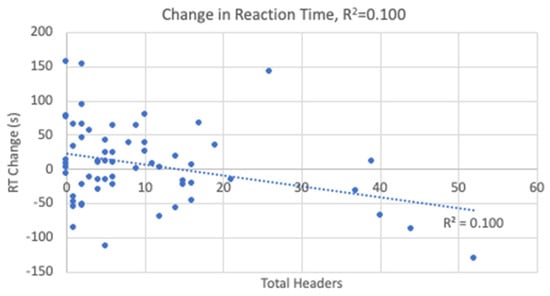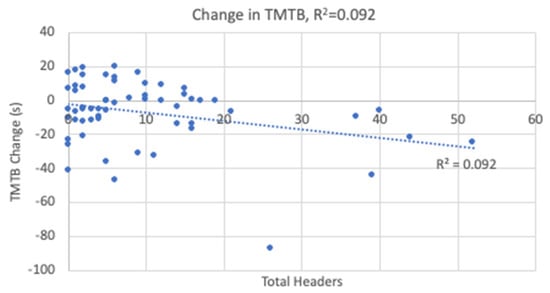 The linear regression analyses resulted in statistical significance for the changes in TMTB and reaction time with the results shown in Table 4. Heading exposure predicted 9.2% of the variance in TMTB (Figure 5) and 10% of the variance in reaction time (Figure 6). Higher heading exposure for both TMTB and reaction time corresponded to significant improvements or decreases in time. A small-to-medium effect size was reported for both TMTB (f2 = 0.11) and reaction time (f2 = 0.11). However, it is important to point out that in looking carefully at the regression lines in both Figure 5 and Figure 6, these changes are likely being driven by 5 players who experienced roughly 1/3 of all the headers logged. As a result, these outliers are driving the reported linear relationships derived in the regression analysis. Heading exposure was not a predictor for the remaining variables.