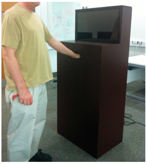 CDR has its roots in the fields of engineering, social sciences, art, and design and is divided between three places of research: the laboratory, the field, and the showroom. CDR uses the steps of firstly iteratively planning, secondly acting either by producing the artefact and/or by carrying out a form of evaluation, thirdly observing, and fourthly reflecting whilst drawing from interdisciplinary knowledge [,]. The author’s application of constructive design research for the TT research involved the making of the artefact (which is described in Section 2.3 and Section 2.4) and placing the artefact in the wild, where it was used as a ‘tool’ to elicit reactions in a similar manner to technology probes []. The interpretative process is described in Section 2.5.3. The author would like to emphasize that the nature of research with design research interventions is context-dependent and returns are not repeatable, even if interventions are carried out in similar conditions. Some noteworthy examples of constructive design research interventions are Dunne and Raby’s [] DesignNoir: the secret life of electronic objects, photostroller [], the CoMotion bench [], the Megafobia V-armchair thrill seeking intervention [], and Blythe’s [] ludic engagement activities in a care home. The latter included the video window, which supports the fifth design principle for the TT in Section 2.3. The benefits of such an approach entail explorations of nexus of experiences and potentially uncovering new connections in an imagined as well as in the real world, externalization of critical thinking, mutual learning for persons involved, as well as the development of new questions [,,].