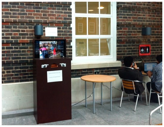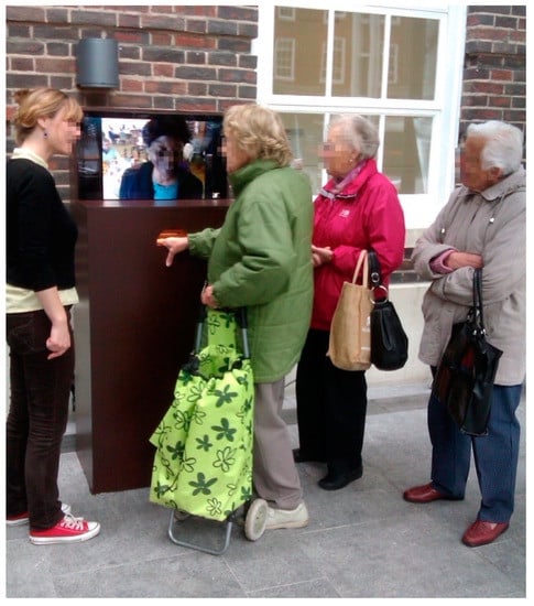 Intervention 1 consisted of a 4-day-long design research intervention to video-connect a day centre by a major charity supporting older people with the entrance hall of a university (see Figure 2). The aim was to connect younger people (i.e., students) and older adults (day centre clients) by providing a window into each other’s world. The researcher’s expectation was that the TT was intrinsically curiosity evoking and people would like to try it out without much prompting []. Furthermore, the author expected people to talk about the TT as a ‘ticket-to-talk’ during the intervention [,].