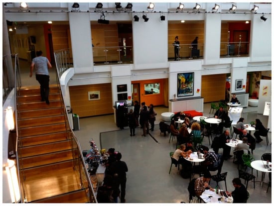 The university had a total of 23,000 enrolled students, however, not all students were always present on campus. The TT was placed in the main entrance hall of the main building, where students and staff could find seating areas, an information desk, and a café. At busy times, the entrance hall could easily accommodate several hundreds of students and staff. A minimum of 25 participants interacted directly and communicated through the TT with day centre clients or with research staff.